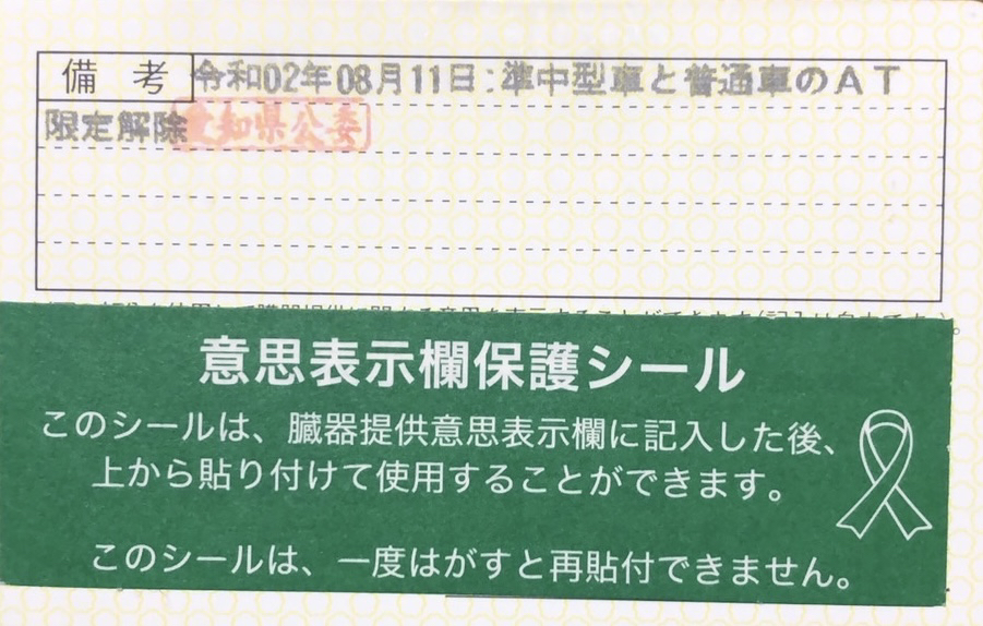 今ある免許証の裏面に『AT車は普通車に限る』の限定を解除する旨が記載されます。免許証の表面に記載されている『普通車はAT車に限る』等の記載は次回の免許更新時か、新たに別の免許証(バイク・トラック等)を取得されない限りはそのまま記載されることになります。